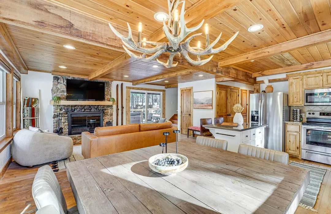 Há cozinha equipada com refrigerador, forno e utensílios de cozinha na Hot Tub And Fireplace Cozy Angel Fire A-Frame Cabin para os hóspedes cozinharem. Zebs Restaurant & Bar é o bar que serve culinária Amerikaanse perto da acomodação de Angel Fire.